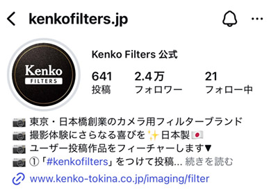 - Kenko Filters 公式Instagram アカウント「@kenkofilters.jp」をフォロー