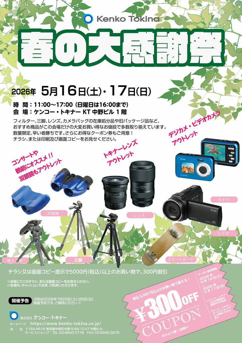 株式会社ケンコー・トキナー(社長:櫻井 匡)は2026年5月16日(土)・17日(日)、ケンコー・トキナー KT中野ビルにてアウトレットセールを開催いたします。