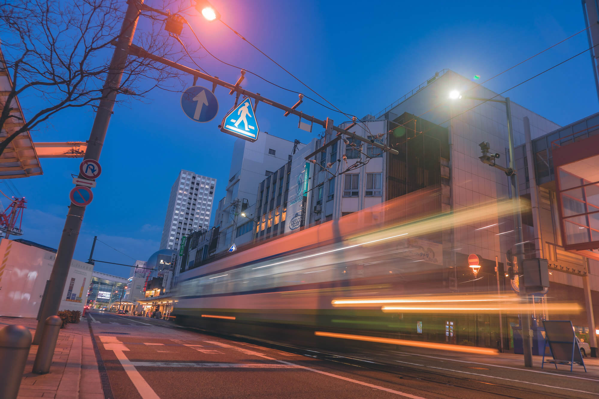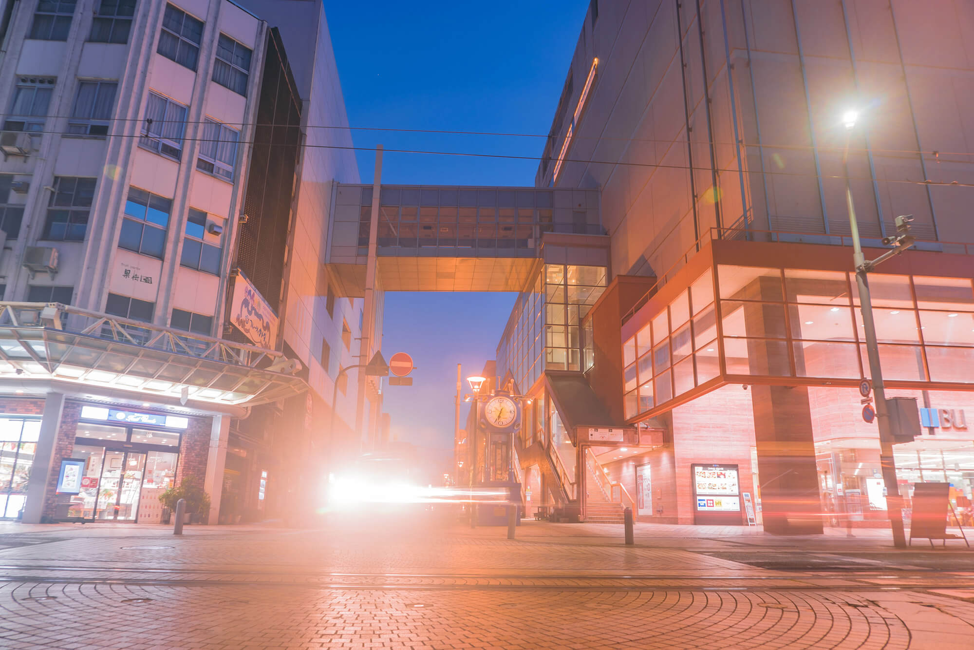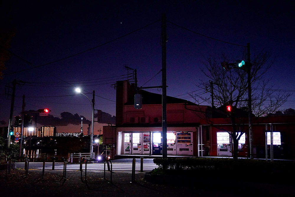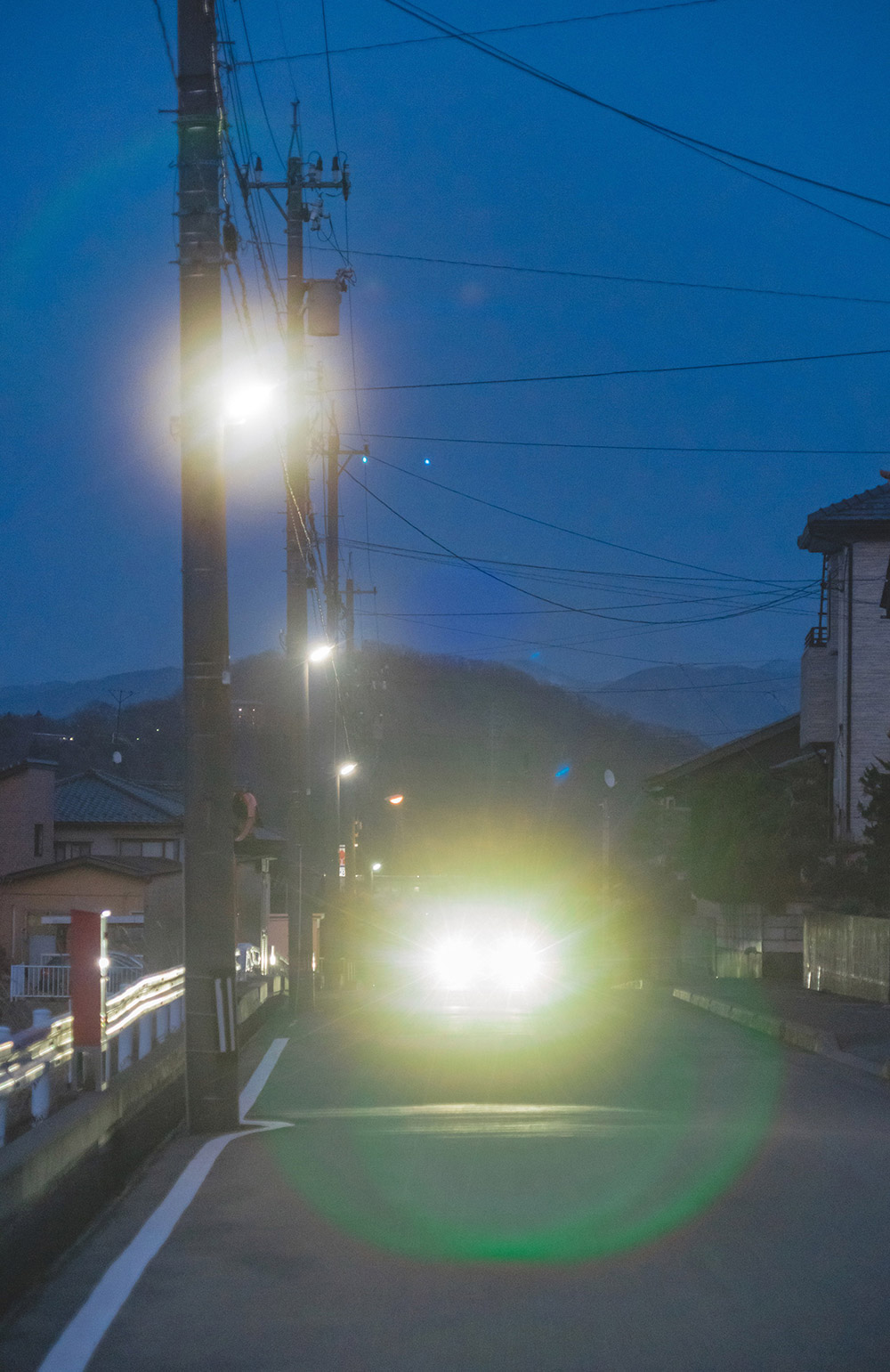日没後の撮影では街灯や信号機、車、自動販売機などの光をふんわりと拡散させてシーンを印象づけます。