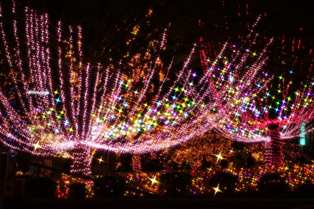従来の一般的なクロスフィルターは光源によっては、光の線が長く出すぎるため、光源が密集しているイルミネーションではくどくなることがありました。「トゥインクル・スター」は一般的なクロスフィルターとは異なる独自製法により、強い点光源でもクロスの線が長く出すぎることがなく、絵に描いたようなかわいい形のクロスでキラキラ感を表現します。