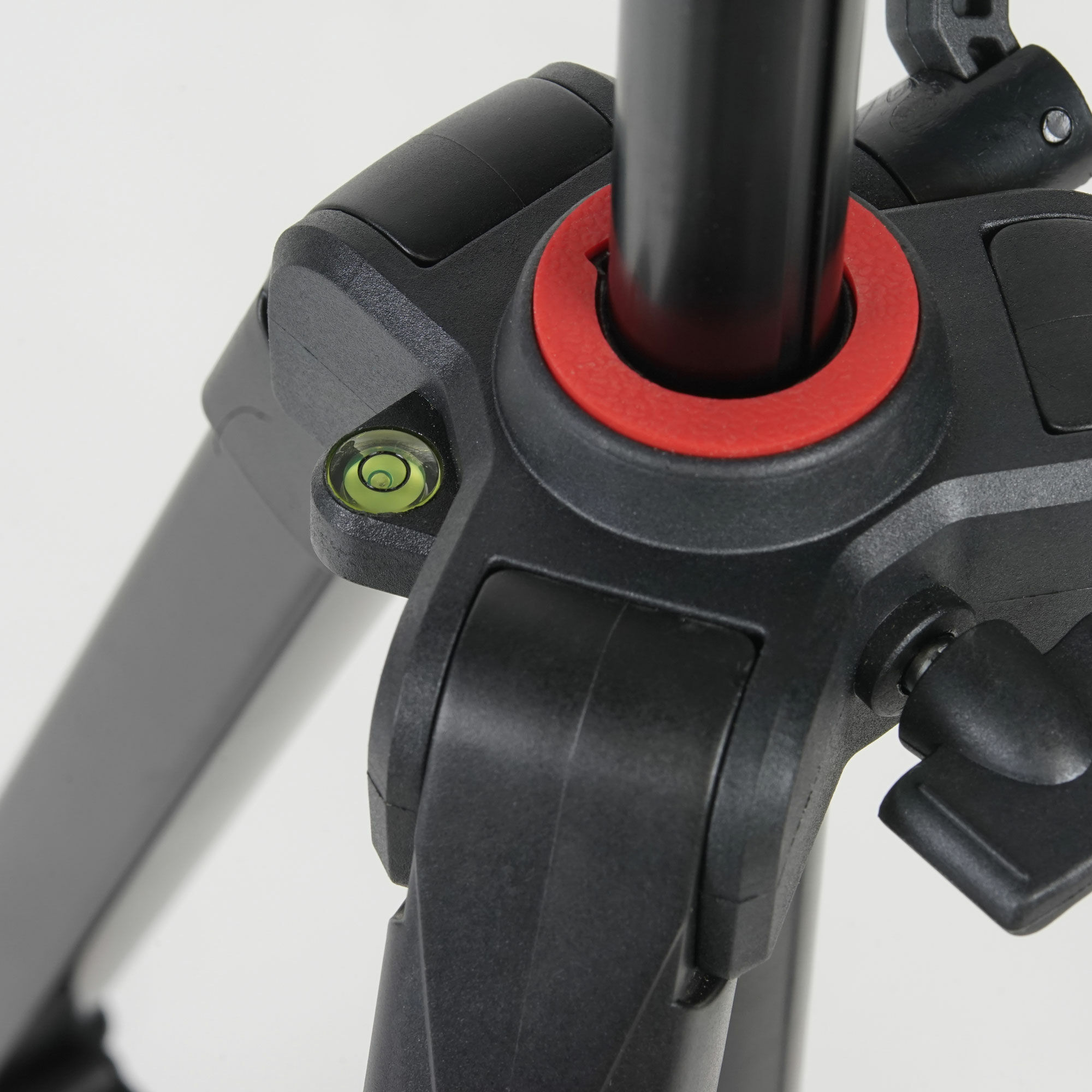 雲台の基部での水平出しの目安となるように、本体部分に水準器を装備しています。脚の長さを調整して水平を出すことで、雲台を左右に動かしても水平を保てます。ギア式エレベーター(ラック&ピニオン方式)