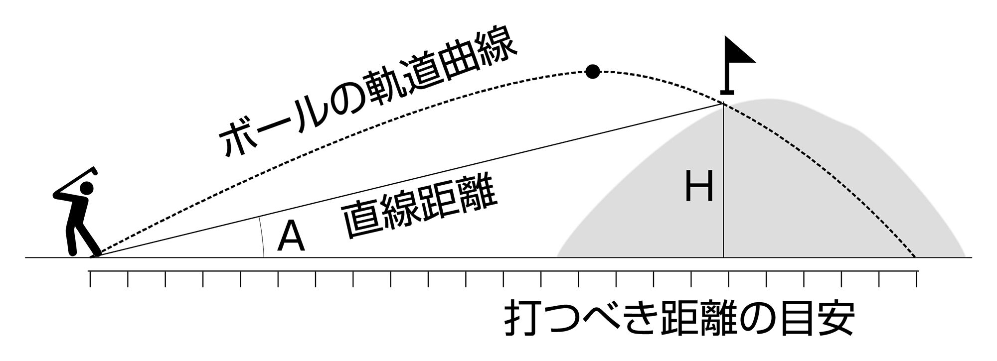 直線距離だけでなく、コースの起伏を考慮した打つべき距離の目安、角度を計測できます。