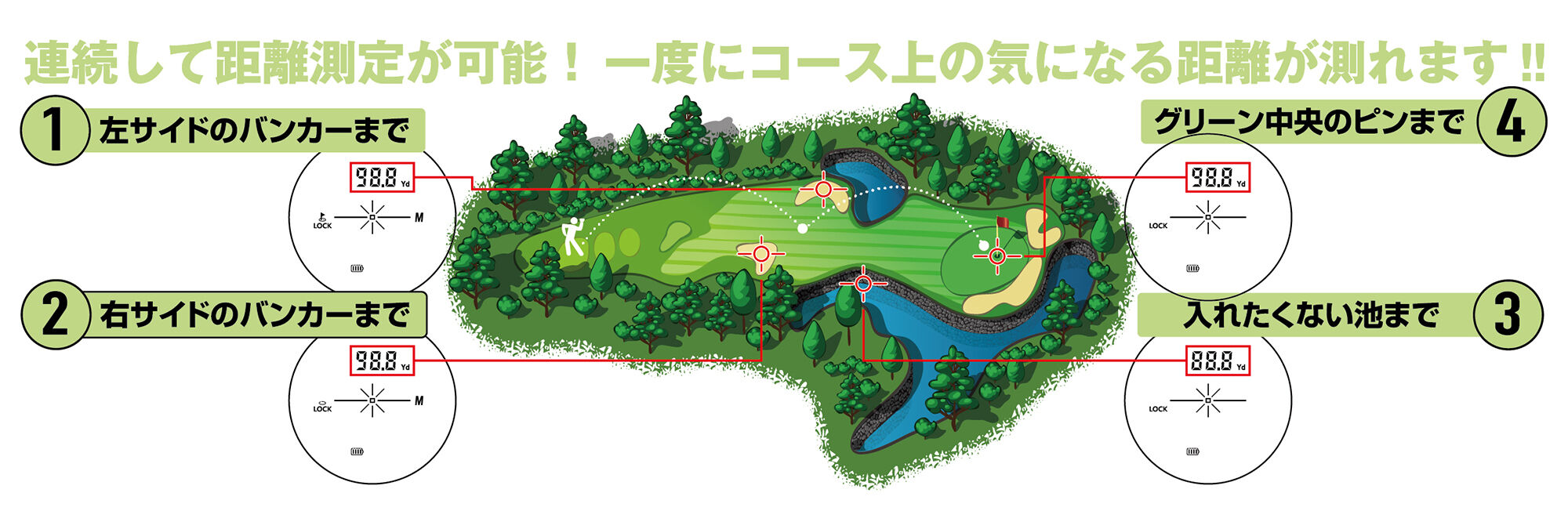 計測ボタンを押し続けると連続距離測定が可能です。池やバンカーの手前と奥までの距離を一気に測れるので便利です。ボタンを押しっぱなしで測定できるので手ブレを軽減できます。