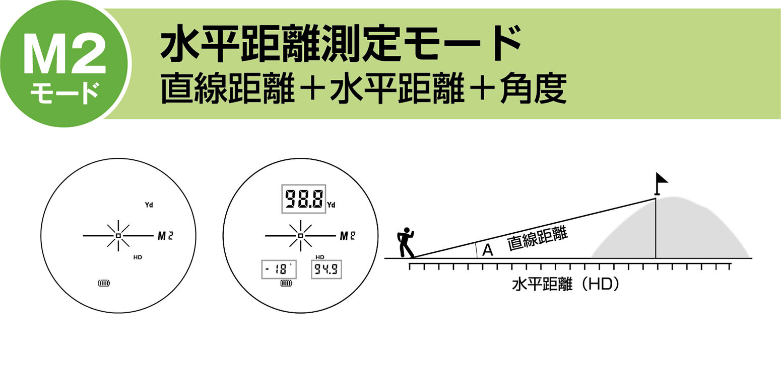 最大1000m先までの距離が計測可能なゴルフ用レーザー距離計。計測ボタンを軽く押すだけで瞬時に距離を測れます。直線距離に加え、高低差をふまえた打つべき距離の目安、角度を計測できます。また目的に応じて競技モードに切り替え可能。