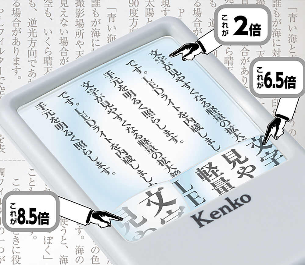メインレンズは倍率2倍と低倍率なので、本や地図を見るのに便利です。小玉レンズは6.5倍、8.5倍と高倍率なので宝石などを見るのに便利です。