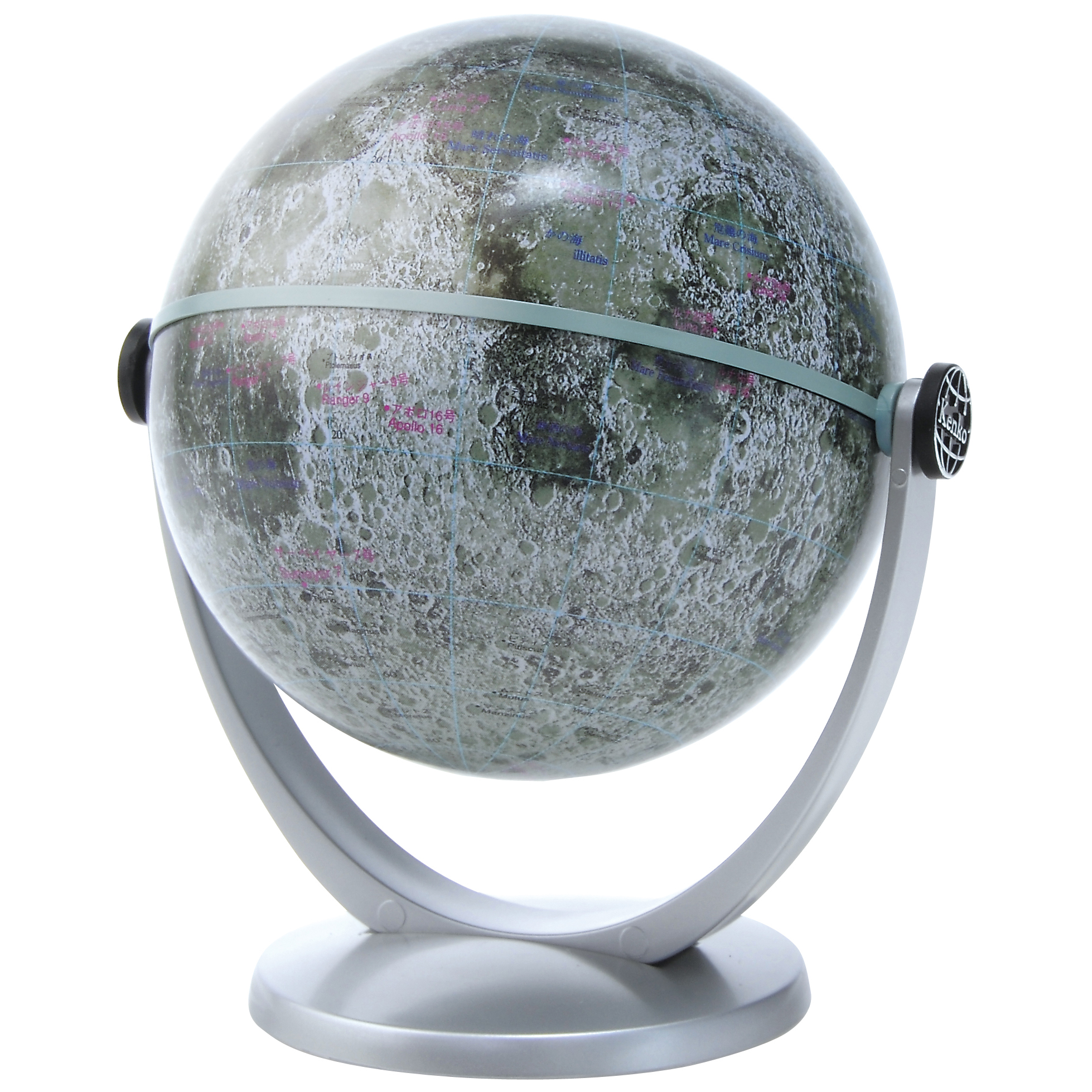 クレーターや海など月の様々な地形を表記した学習用月球儀。アポロの月面着陸地を記載。360度回転可能。