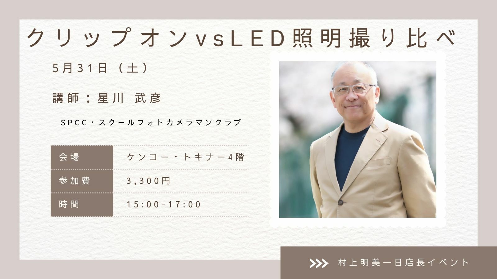 | イベント名 | 2025年5月31日(土)スクールフォトカメラマンクラブ クリップオンvsLED 照明撮り比べイベント(星川武彦先生・村上明美一日店長イベント) |