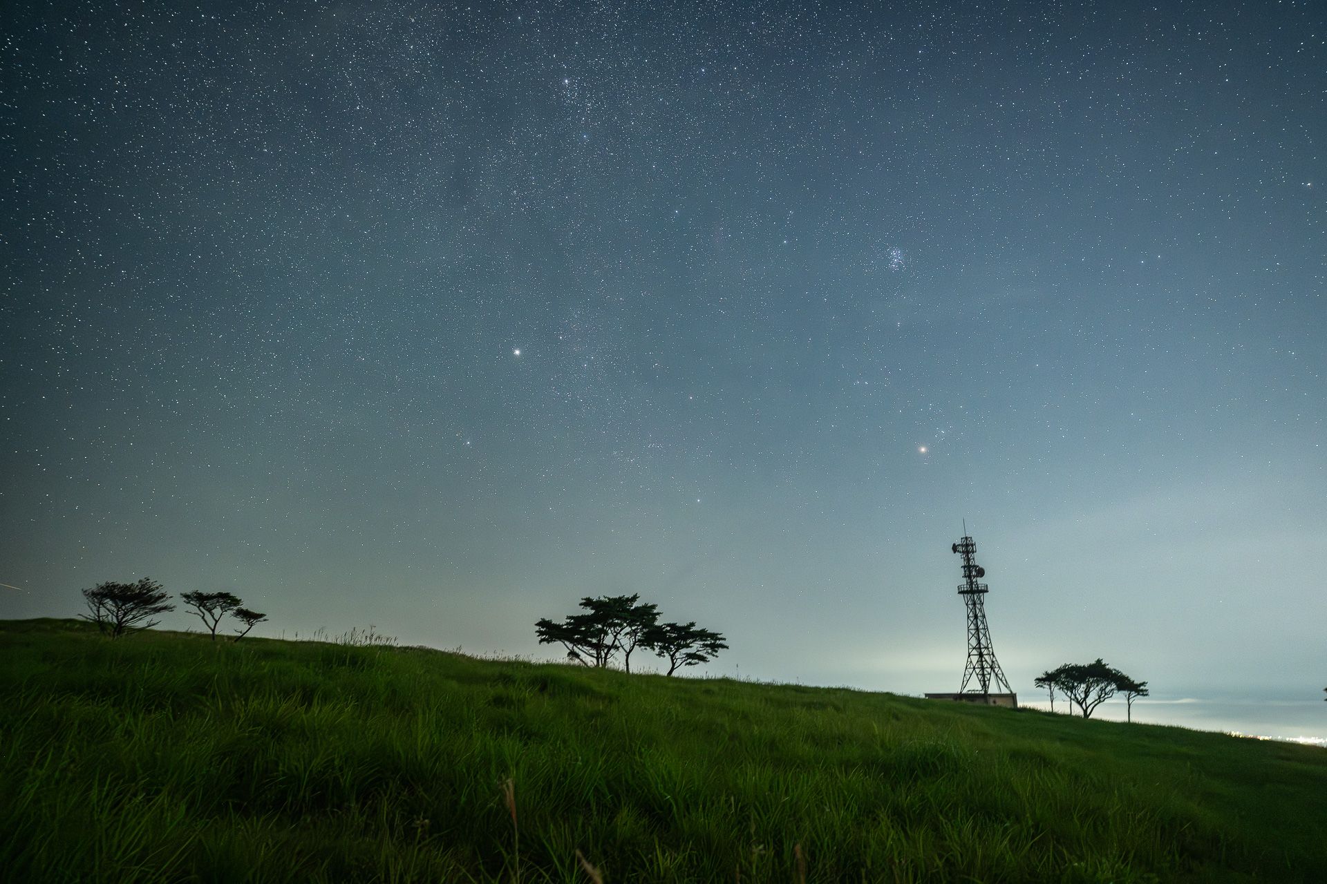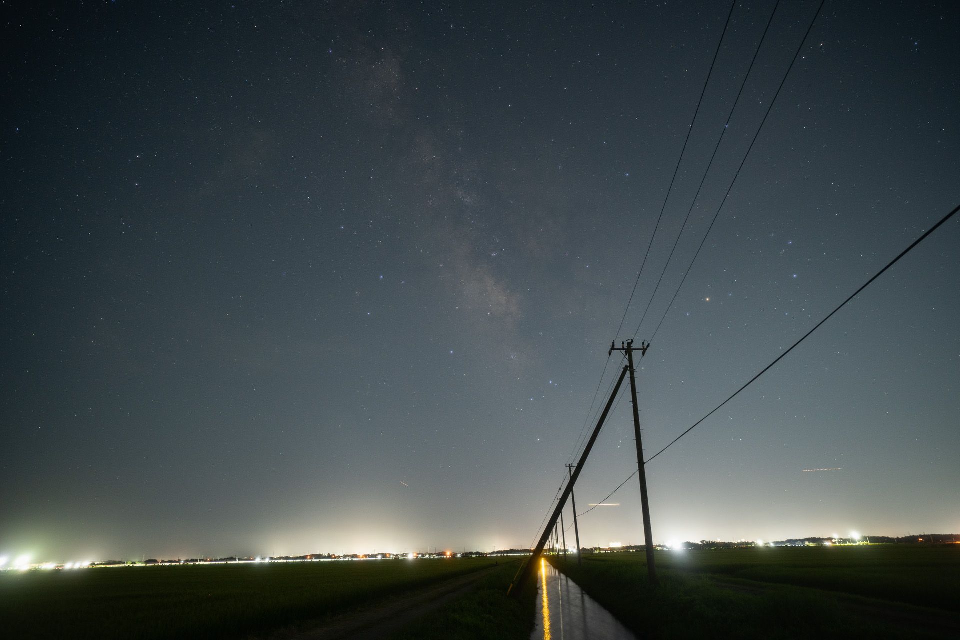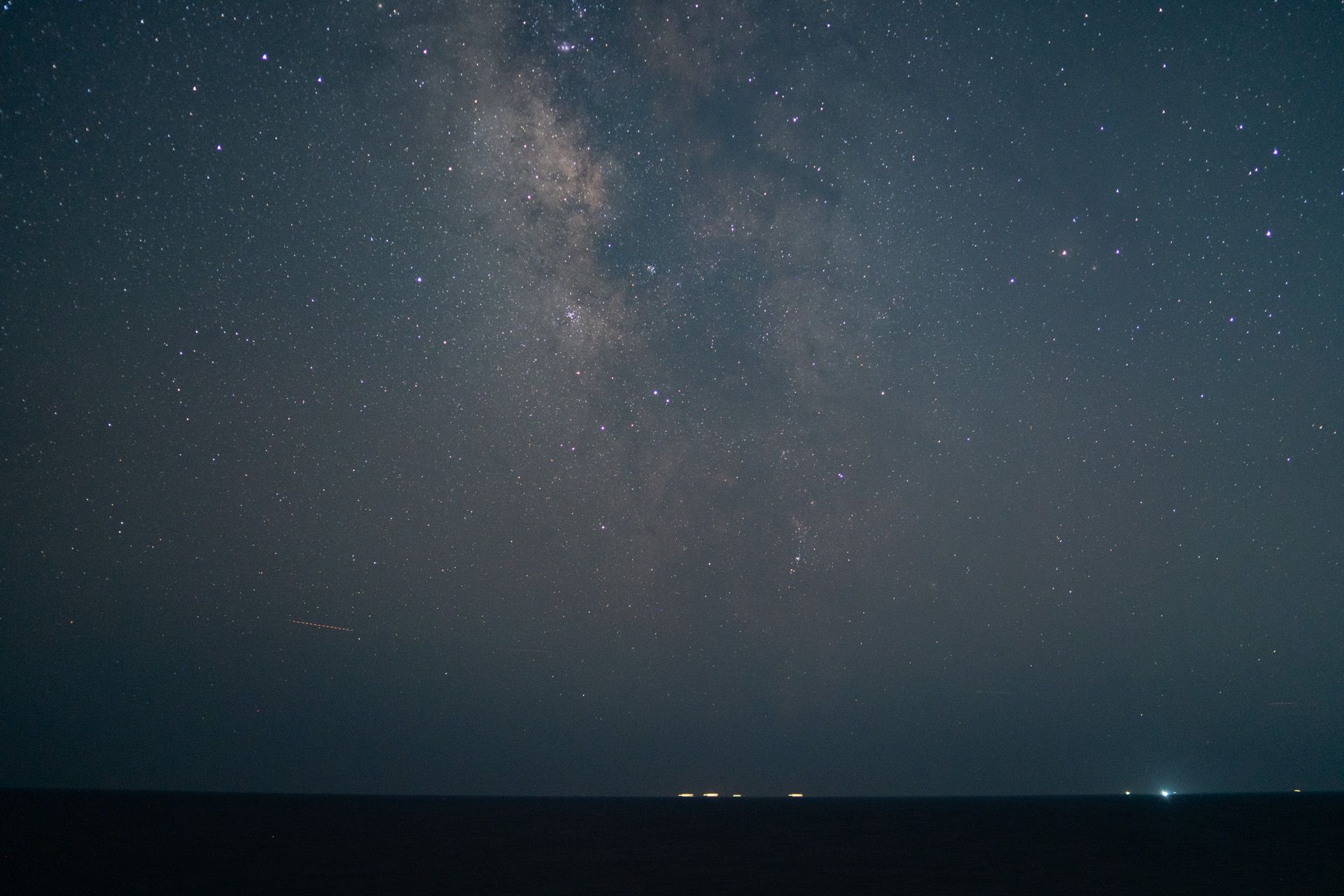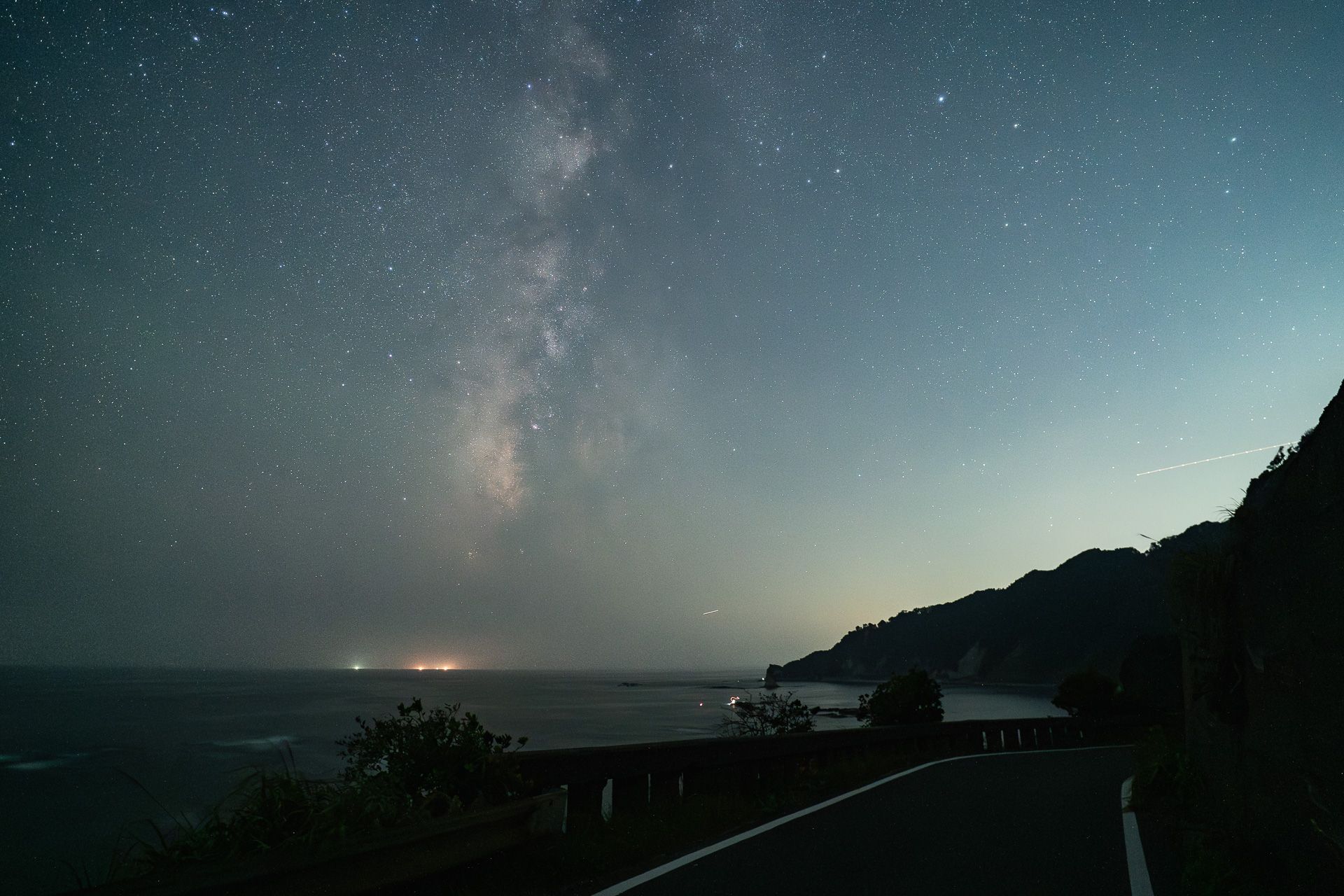 ここは大きな漁港と市街地が近く光害の影響が大きいため、あまり露光をかけることができないため、天の川の描写は少々心許なくなっているが、街灯が映り込む分ハーフフィルターの効果がわかりやすい。