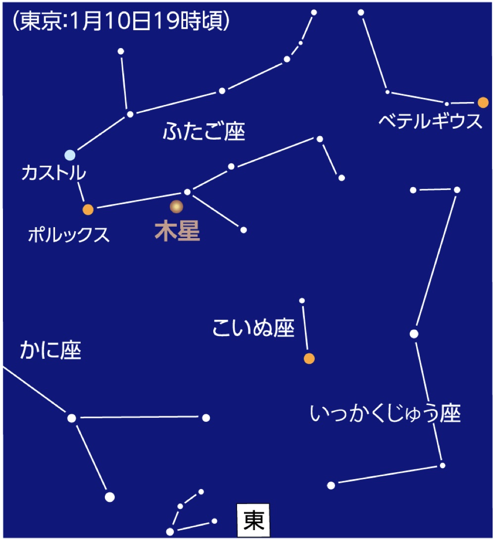 木星がふたご座で「衝」となります。「衝」とは外惑星がもっとも地球に近づき、明るくなる時期です