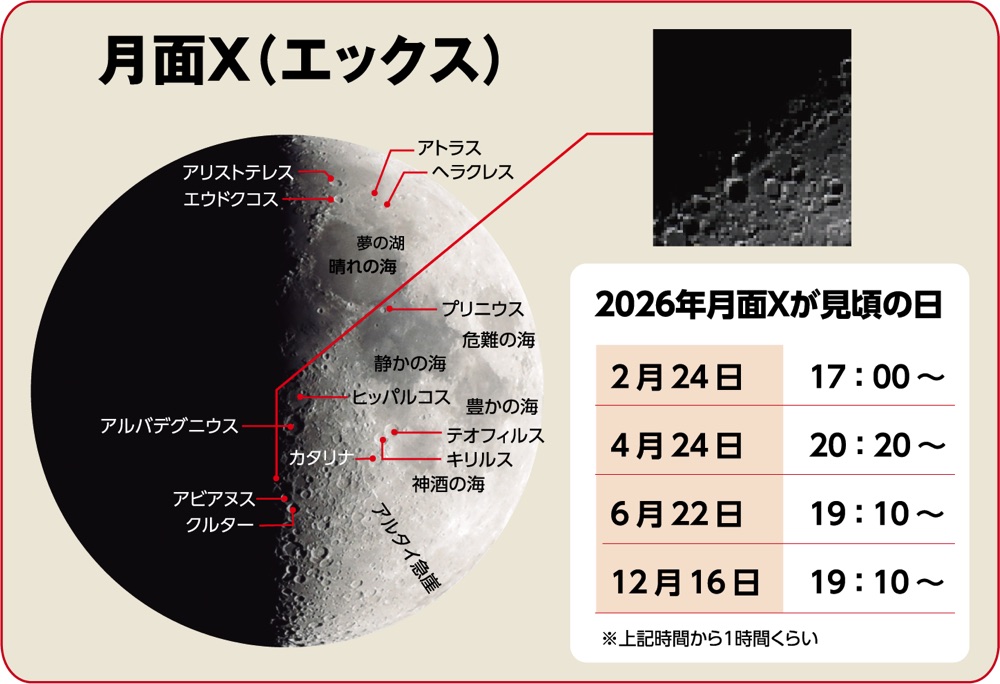 月面Xとは上弦の月の頃、月の明暗の境の地形に「X」の文字が浮かび上がる現象をいいます。プランキヌス、ラカイユ、プールバッハという3つのクレーター壁によってできた地形で月面の暗いところに浮かび上がって見えます。継続時間が1時間程度と短く条件が揃ったときにしか見えません。
