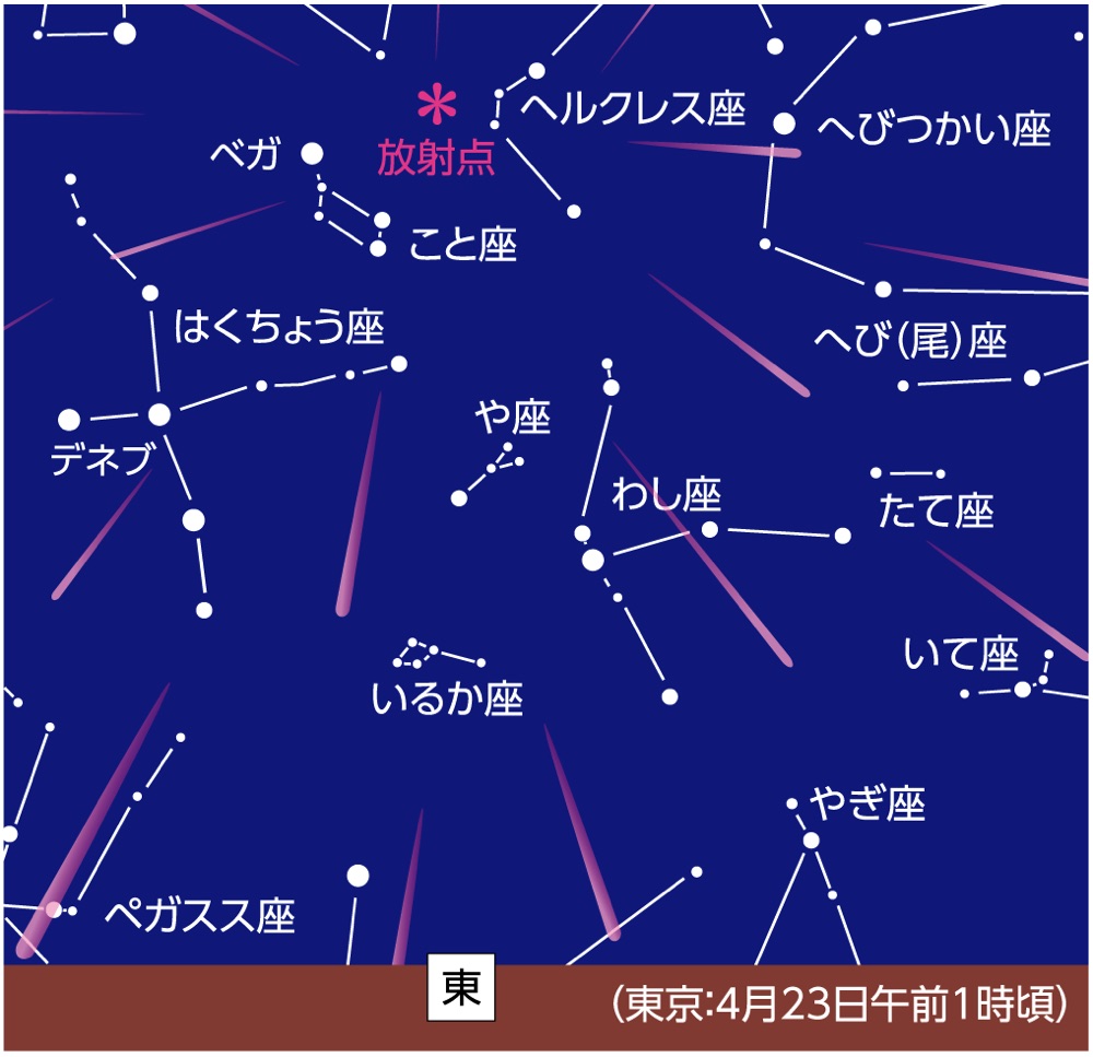 22日26時頃(23日2時頃)こと座の一等星ベガの近くに放射点のある「4月こと座流星群」が極大となります。上弦の月があるので月の高度が下がってきてからの方が観測しやすいでしょう。