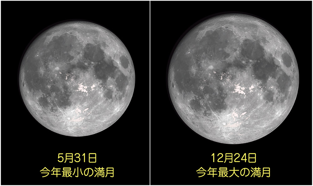 12月24日の満月は視直径33.5′(距離35.674万㎞)で、2026年で最も大きく見える満月となります。スーパームーンとは天文用語ではなく、占星術等でスーパームーンはその年最も大きく見える満月、ミニマムーンはその年の最も小さな満月を指すようです。