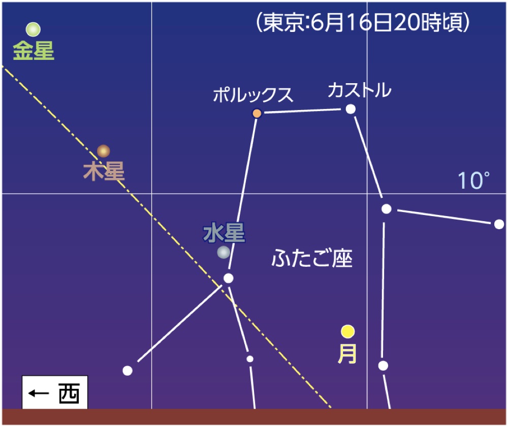 6月16-17日水星が東方最大離角/夕方の西の空で、月、水星、木星、金星が集合