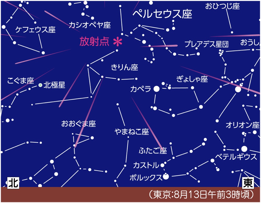 13日 日中にペルセウス座流星群が極大になると予想されています。月がないため暗夜での観測ができます。12日の夜から13日の未明にかけて出現数が増えていくと思われます。また13日から14日にかけても多数の出現が期待できます。ペルセウス座流星群には、明るく痕を残す流星が多く、特に夜半過ぎに出現数が多くなる傾向があります。