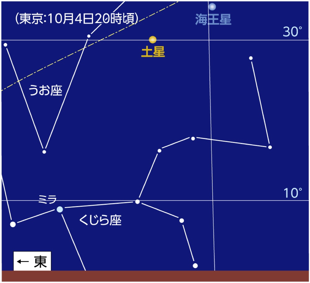 土星がうお座で「衝」となります。「衝」とは外惑星がもっとも地球に近づき、明るくなる時期です(光度0.3等)。土星の環は、去年は真横から見ることとなり見えませんでしたが今年は薄い輪が見えるでしょう。この時期は土星の絶好の観望時期となりますので、シーイングの良い日を選んで観察してみてください。