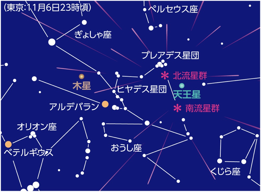 天王星がおうし座で「衝」となります。5.6等の明るさがあり視直径は3.7″となります。天王星は太陽からかなり離れた場所にあるため、その位置は毎年大きな動きはありません。町明かりのない暗い場所で、肉眼で探してみてください。天体望遠鏡で見ると他の星とは違い青緑色に見えます。