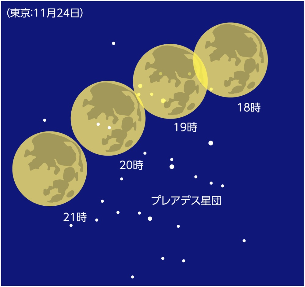 24日18時頃から21時頃にかけて満月直前の月がプレアデス星団の星を隠しながら横切っていきます。プレアデス星団は月の通り道にあるので、たびたびこのような現象が見られます。今回はかなり深いところまで月が侵入しますので双眼鏡や望遠鏡で観測してみてください。