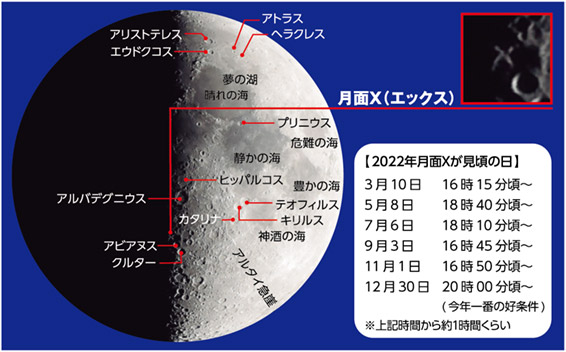 月面Xとは、上弦の月の頃、クレーターの縁の部分に太陽光が当たって、月の明暗の境に「X」の文字が1時間程度浮かび上がる現象です。3月10日は16時15分頃から約1時間が観測のチャンスです。東京の日没は17時44分です。