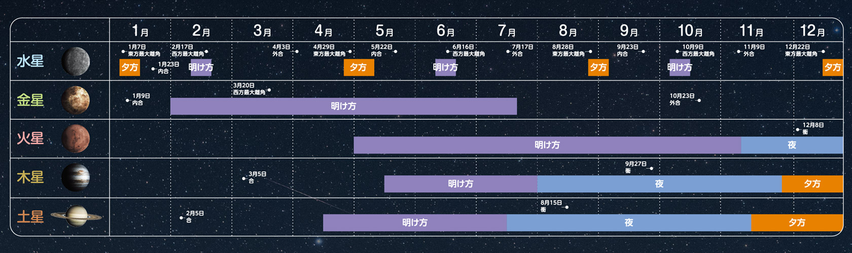 1月9日の内合に向かって太陽に接近して行き、2月に入ると明け方の東の空に明けの明星として見え始め、7月中旬くらいまで明け方の東の空で輝きます。10月23日には外合となり、年末頃には日没後の西の空で宵の明星として輝き始めます。