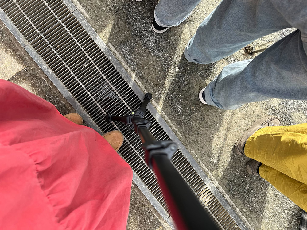 見てください!この幅!三脚を開いたって側溝の幅より狭いんです!もちろん、MAXに開いて低い高さで使用することも可能。