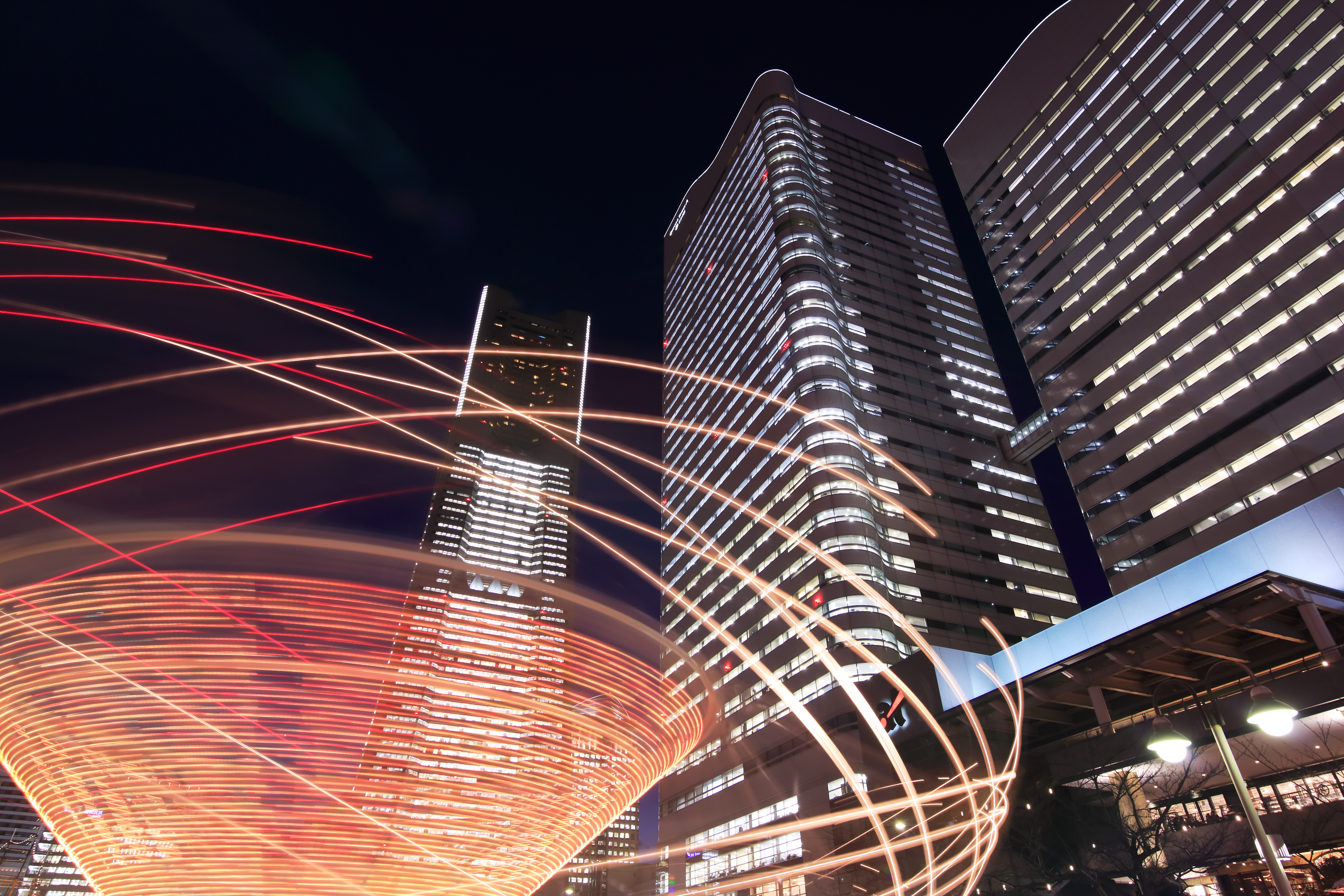 でも建物だけを撮っても味気ないので、手前に回転する遊園地の遊具を入れてみた。三脚を使ってシャッターを開けているだけで簡単にきれいな光跡が撮れるので、ぜひ試して欲しい。