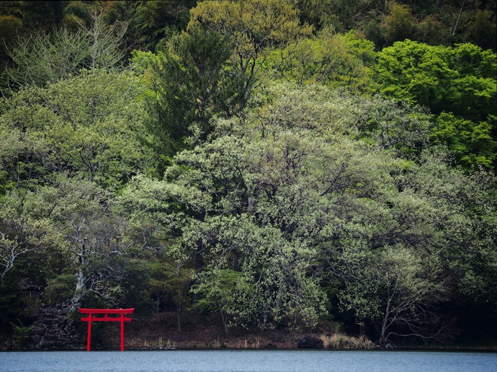 火山活動によって作られた伊豆半島の名所「一碧湖」。湖畔の全長はおよそ4Kmで、カメラ位置から鳥居がある対岸までの距離はおよそ500mを下らない。人気撮影スポットのひとつで、多くの美しい写真が撮られている場所だ。 風景撮影では全体像を写す方法以外にも、望遠レンズで画面の一部をトリミング。情報を整理することでも美しさが引き出せる。解像感の凄さはご覧のとおりで、彼方の情景がまるで手が届く距離にあるように写っている。
